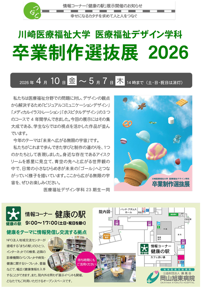 私たちは医療福祉分野での問題に対し、デザインの観点から解決するため「ビジュアルコミュニケーションデザイン」「メディカルイラストレーション」「ホスピタルデザイン」の3つのコースで4年間学んできました。今回の展示にはその集大成である、学生ならではの視点を活かした作品が並んでいます。